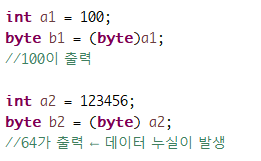 큰 공간에서 작은 공간의 메모리로 이동 ex) int형(4byte) → byte형(1byte) : 원래 자료형보다 메모리가 작은 자료형으로 형변환 되었기 때문에 데이터가 누실될 수 있다. ![]() |