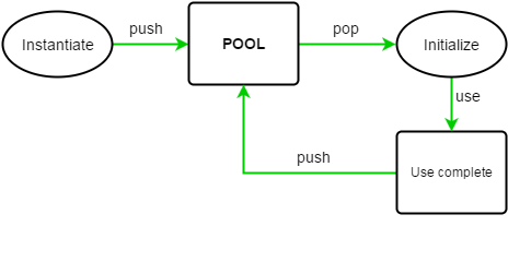 오브젝트 생성 → 오브젝트 풀에 넣음 → 꺼냄 → 사용전 초기화 → 사용 → 사용종료 → 다시 오브젝트 풀에 넣기